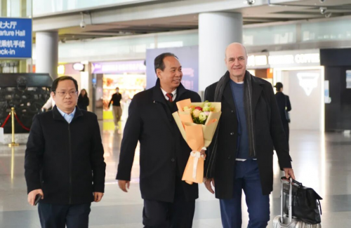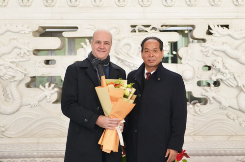 張占宗院長(中)熱烈歡迎瑞典首相賴因費爾特到達北京
